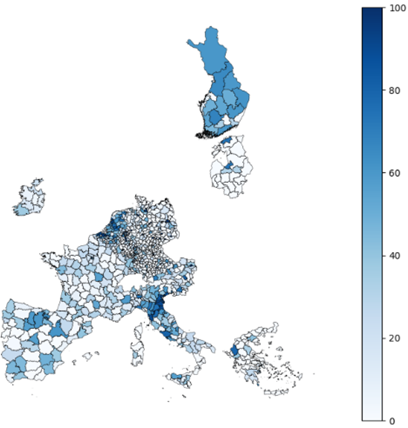 a) Map of municipalities, gradient coloured by share of affected firms in the granular physical risk scenario |