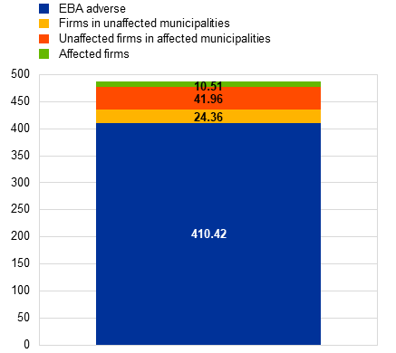 This box presents a sensitivity analysis of the 2025 EU-wide stress test results looking at the effects of acute physical risks on corporate loan quality. The EBA’s 2025 adverse scenario captures the main cyclical risks faced by the EU banking sector, but does not account for climate risk, despite its potential to trigger significant and systemic losses.[5] In this box, bank resilience is therefore assessed against the stress triggered by the financial and the real-economy shocks underpinning the EBA’s adverse scenario in conjunction with the materialisation of acute climate physical risks. The analysis focuses on credit risk, the primary transmission channel through which physical risks affect banks’ financial soundness. It concentrates on corporate loans, considering both data availability and the ubiquity of the business practice of ensuring residential mortgage collateral for physical risk. The analysis is limited to flood events, as these are the best documented in terms of their direct impact on firms’ activity. However, including other physical climate hazards (e.g. wildfires or droughts) would provide a more comprehensive view of country and sector-specific heterogeneity, as exposure to different types of risks varies widely across countries.
