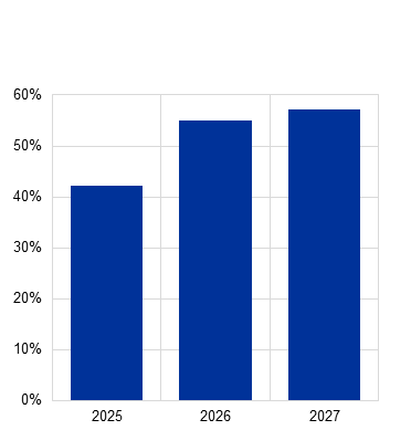 Building on the NGFS NDCs scenario, a short-term transition risk scenario is constructed, reflecting pledged emissions targets and delayed policy action. While climate risk scenarios are typically designed with a long-term horizon, transition risks can also be highly relevant in the short term. This article adopts a short-term perspective on climate transition risk using the 2025-27 path of the NGFS NDCs scenario. This incorporates all pledged emission reduction targets announced by individual countries as of March 2024, even where they have not yet been accompanied by effective policies.[3] Specifically, the NGFS NDCs scenario foresees a shift in the EU energy mix, marked by a reduction in the consumption of fossil fuels such as gas and coal and growing reliance on renewables and electricity, driven by firm-level green investments. Out to 2027, the share of gas, coal and oil in the energy mix is projected to decrease, while renewables are expected to experience a substantial increase, reflecting the transition towards cleaner energy sources (Chart 1, panel a).