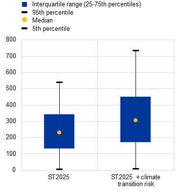 Analysing transition and physical climate risks reveals a moderate yet consequential impact on bank resilience, highlighting the importance of comprehensive financial risk assessments. As authorities across the euro area work towards including climate risks in regular stress-testing frameworks, this analysis offers a starting point for a sensitivity analysis exploring bank resilience to transition and physical climate risks under an adverse macroeconomic scenario (see EBA, 2024). For transition risk, the analysis shows that the additional impact of transition risk on CET1 capital depletion is moderate on aggregate, at 74 basis points, with the largest part of the impact stemming from exposures to high energy-intensive sectors. The impact of physical risk is assessed in Box 1, looking at a sensitivity analysis where a lack of, or delayed and fragmented transition, policies is associated with higher physical risk over the medium term. The impact of acute physical risk is estimated to increase CET1 capital depletion by 77 basis points beyond the depletion indicated by the EBA’s adverse scenario. Our analysis indicates that transition and physical climate risks can have a moderate but consequential impact on banks’ capital ratios. Additionally, the banks most exposed to climate-related losses may differ from those identified as most vulnerable in the broader EU-wide assessment (see Rodriguez d’Acri and Shaw, 2025). Together, these findings underscore the importance of incorporating both types of climate risk into regular financial stability assessments.